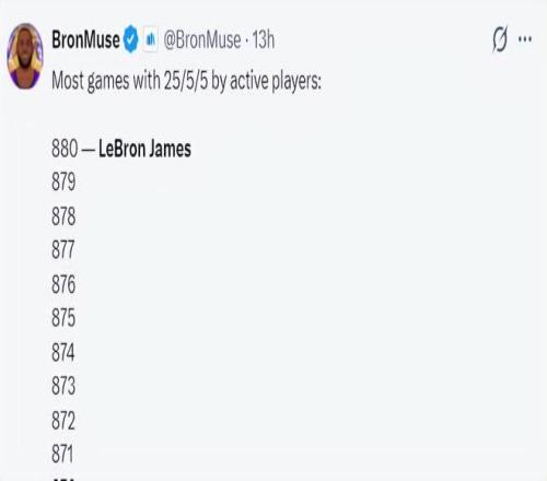 勒布朗目前已經(jīng)完成880次單場(chǎng)25+5+5斷崖第一,排名第二的是哈登392場(chǎng),威少350次、杜蘭特350次,勒布朗實(shí)在是太厲害了。