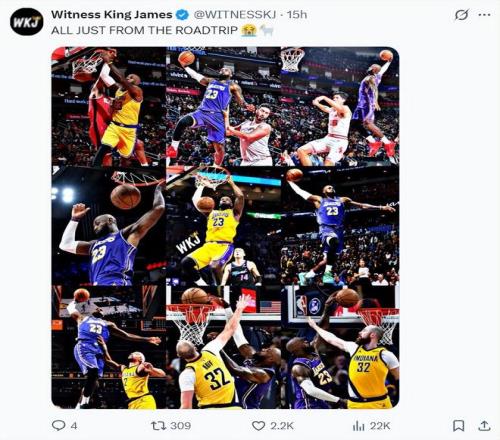 根據(jù)湖人媒體WKJ的統(tǒng)計(jì),在湖人六連客(5勝1負(fù))中,41歲的老頭勒布朗合計(jì)15次暴扣,場(chǎng)均2.5次暴扣,他是聯(lián)盟30歲以上唯一一位能完成這一數(shù)據(jù)的球員(35歲都無人能做到包括中鋒)。