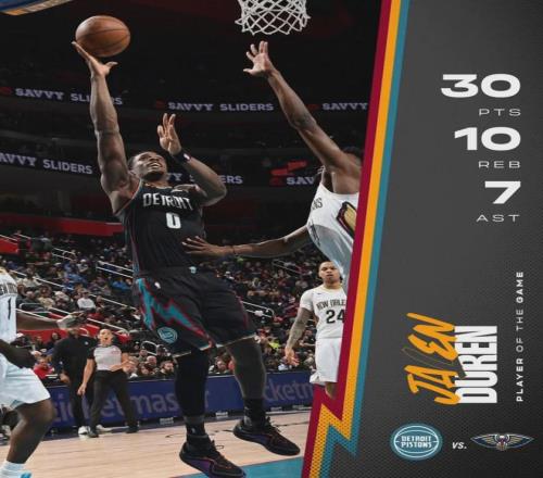 北京時(shí)間3月27日,NBA常規(guī)賽,活塞主場129-108大勝鵜鶘?;钊麪钤矊幇惨驓庑乩^續(xù)缺陣,他已經(jīng)連續(xù)5場休戰(zhàn)?;钊麅?nèi)線杰倫-杜倫投籃12中10,罰球12中10,狂砍30分10籃板7助攻2搶斷2蓋帽,單場助攻數(shù)追平生涯紀(jì)錄!