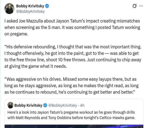 賽后凱爾特人主帥馬祖拉談到這一點(diǎn)時(shí)表示塔圖姆的登場(chǎng)時(shí)間是根據(jù)比賽需要安排制定,同時(shí)會(huì)觀察他的身體狀態(tài),教練組沒(méi)有為其固定出場(chǎng)時(shí)間,但他已經(jīng)連續(xù)好幾場(chǎng)比賽打滿了第四節(jié)。