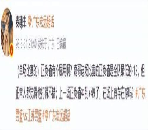 廣東男籃完成復(fù)仇,廣東媒體人麥穗豐老師也站出來為備受質(zhì)疑的張皓嘉發(fā)聲了,他在社交平臺(tái)公開發(fā)聲,“(單場(chǎng)比賽的)正負(fù)值有個(gè)屁用???嘉哥這場(chǎng)比賽的正負(fù)值是全隊(duì)最低的-12,但正常人都覺得他打得不錯(cuò);上一場(chǎng)正負(fù)值沖到+49了,在場(chǎng)上有存在感嗎?”