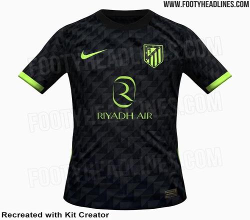 這款球衣在深色底衫上加入了微妙的幾何紋理,由重復(fù)三角形組成,形成現(xiàn)代感的鋸齒效果,胸部與袖子均有延展。黑色圓領(lǐng)簡(jiǎn)約大方,袖口和側(cè)面面板使用熒光綠色邊飾,與耐克Logo、贊助商Riyadh Air以及馬競(jìng)徽章的熒光綠相呼應(yīng),整體呈現(xiàn)高度統(tǒng)一的單色美感。