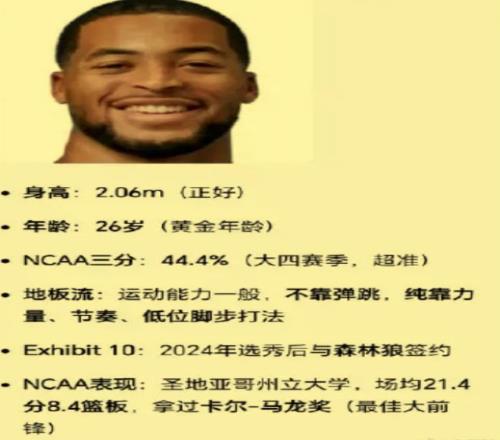 這個(gè)杰登勒迪真正成名是在他的大學(xué)時(shí)期,身高2米06的他,2023年效力于圣地亞哥州立大學(xué),因其率領(lǐng)球隊(duì)取得3勝0負(fù)的成績的同時(shí),自己場均也可以得到28.7分和12個(gè)籃板球的兩雙數(shù)據(jù),所以2023年11月21日被評(píng)為當(dāng)周全美最佳球員。