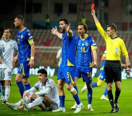 據(jù)報道,在與波黑的附加賽決勝局中,意大利在點球大戰(zhàn)中失利,連續(xù)第三次無緣世界杯,巴斯托尼在第41分鐘因?qū)γ访灼娴姆敢?guī)被直接紅牌罰下,使得他的球隊在整個下半場和加時賽中都少一人。