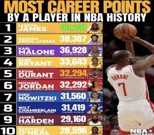 杜蘭特和哈登都到了生涯末期,退役前在NBA歷史得分榜上能排第幾?杜蘭特目前歷史第5,距第4的科比只差1349分,超越只是時間問題。但最大的懸念是:他還能填平4600多分的坑去沖第3嗎?哈登目前歷史第9,轉(zhuǎn)型后得分速度正在變慢。面對前面的張伯倫、諾維茨基和喬丹,他的極限到底在哪?
