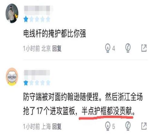 本場比賽,北京隊的籃板以33-41輸給浙江,且讓浙江隊足足搶了17個進(jìn)攻籃板,而北京隊只有6個。面對浙江的大外援約翰遜,周琦可以說是毫無應(yīng)對之策,最后四分鐘,周琦在場上不卡位不搶籃板,防守甚至連手都不伸一下,可以說將“籃球公務(wù)員”的屬性體現(xiàn)地淋漓盡致。