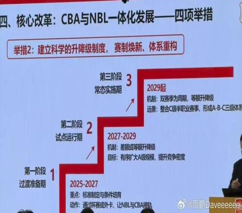 本周,官方召開會議,其中關(guān)于未來聯(lián)賽格局成為重點,也就是大家所說的“升降級”,和此前全明星周末期間進行的CBA投資人會議討論的保持一致:2025-2027年為過渡準(zhǔn)備期、2027-2029年為試點運營期、2029年起為常態(tài)實施期。