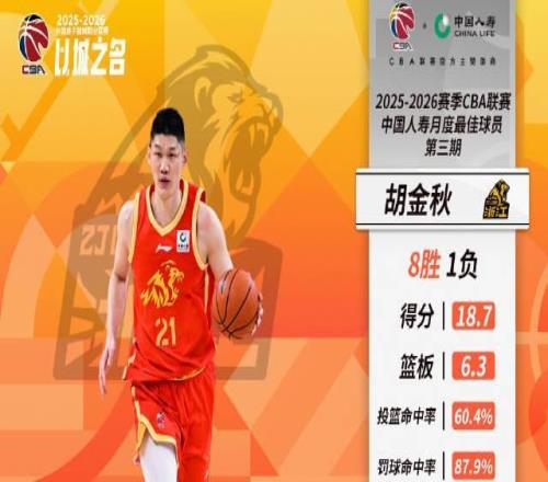 CBA官方寫道:“浙江廣廈籃球俱樂部球員胡金秋在第24-32輪的比賽中,出戰(zhàn)9場并率隊取得8勝1負的戰(zhàn)績,他場均出場26分鐘,能夠得到18.7分、6.3籃板、1.4助攻的數(shù)據(jù),投籃命中率60.4%、罰球命中率87.9%?!?/p>