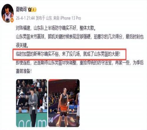 山東隊媒體人夏曉司直言:“斯蒂爾正成為球隊真正的大腿?!彼粌H是得分核心,更是戰(zhàn)術(shù)支點——在克里斯缺陣期間,他撐起了山東隊的內(nèi)線攻防體系,助球隊豪取兩連勝。