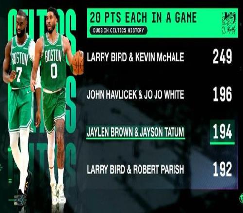 賽后根據(jù)統(tǒng)計,本場比賽是杰倫-布朗和塔圖姆生涯至今第194次在凱爾特人達成NBA單場比賽得分均為20+,這一數(shù)據(jù)位列凱爾特人隊史雙人組的第三位,僅次于拉里-伯德和凱文-麥克海爾的249次以及約翰-哈夫利切克和喬-喬-懷特的196次,領先于拉里-伯德和羅伯特-帕里什的192次。