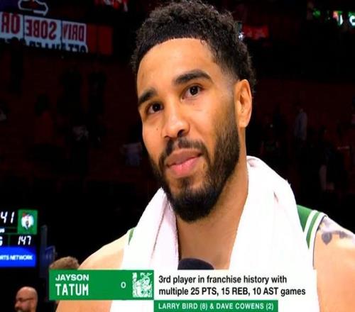 賽后根據(jù)統(tǒng)計(jì),本場(chǎng)比賽25分18籃板11助攻的數(shù)據(jù)也讓塔圖姆成為了凱爾特人隊(duì)史繼拉里-伯德(8次)和戴夫-考恩斯(2次)之后,第三位單場(chǎng)交出至少25分15籃板10助攻數(shù)據(jù)的球員。