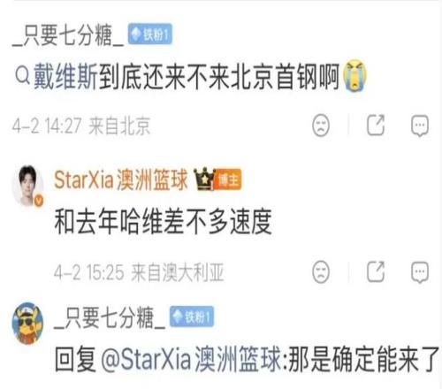 在賽后的新聞發(fā)布會上,北京男籃主教練許利民也表達(dá)了對球員表現(xiàn)的不滿。另外他還被問到了球隊是否會對外援升級的問題。對此許利民表示,球隊也一直在挑選更好的外援,但具體還要根據(jù)實(shí)際情況決定。隨后有北京球迷詢問了身在澳大利亞的媒體人“StarXia澳洲籃球”戴維斯是否會加盟北京男籃的問題,該媒體人表示,戴維斯加盟北京男籃的時間會和去年哈維加盟上海男籃的時間差不多。也就是說,戴維斯是確定會加盟北京男籃的,雙方應(yīng)該已經(jīng)達(dá)成了加盟意向。
