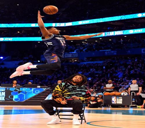 資料圖:2019年美職籃(NBA)全明星周末上,J.Cole作為嘉賓參與扣籃大賽