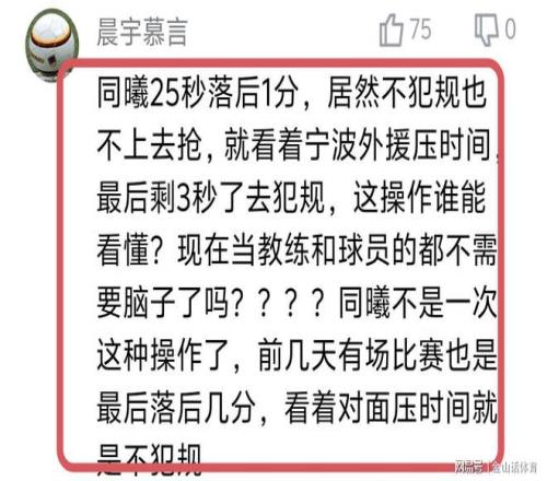 同曦主帥王世龍連續(xù)2場犯低級(jí)錯(cuò)誤,賽后也被球迷紛紛吐槽?!巴?5秒落后1分,居然不犯規(guī)也不上去搶,就看著寧波外援壓時(shí)間,最后剩3秒了去犯規(guī),這操作誰能看懂?現(xiàn)在當(dāng)教練和球員的都不需要腦子了嗎?”:“”同曦不是一次這種操作了,前幾天有場比賽也是最后落后幾分,看著對(duì)面壓時(shí)間就是不犯規(guī)”;“南京主教練,看得出來你很怕贏球,所以拖到3秒才犯規(guī)”;“王世龍連著兩場最后時(shí)間不安排犯規(guī)戰(zhàn)術(shù),下課吧!”……