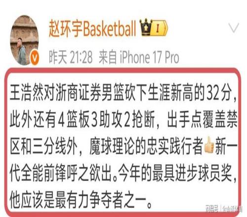 賽后,媒體人趙環(huán)宇社交平臺發(fā)文,對王浩然的表現(xiàn)贊不絕口:對浙商證券男籃砍下生涯新高的32分,此外還有4籃板3助攻2搶斷,出手點覆蓋禁區(qū)和三分線外,魔球理論的忠實踐行者,新一代全能前鋒呼之欲出。今年的最具進步球員獎,他應(yīng)該是最有力爭奪者之一。