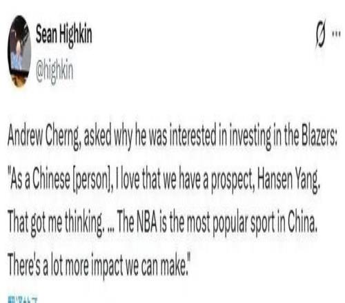 隨后,程正昌繼續(xù)說,楊瀚森是我最喜歡的球員之一,他擁有無限人格魅力,他一出場(chǎng)就能引發(fā)歡呼。很多人不知道,籃球在中國非常流行,關(guān)注度很高,我們應(yīng)該利用這一點(diǎn),以楊瀚森為媒介,擴(kuò)大開拓者隊(duì)在中國乃至亞洲的影響力。程正昌還強(qiáng)調(diào),火箭隊(duì)因?yàn)橐γ鞯某晒?,而在中國火?0年,至今仍有無數(shù)擁躉,這條路已經(jīng)打通了,開拓者只需抄作業(yè)。Andrew程正昌還表示,新秀賽季的楊瀚森發(fā)展在預(yù)期之內(nèi),雖然目前并不出類拔萃,但他未來至少能成為首發(fā)球員。