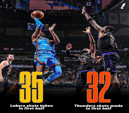 第十二,雷霆上半場甩進(jìn)32球,限制湖人只出手35次。