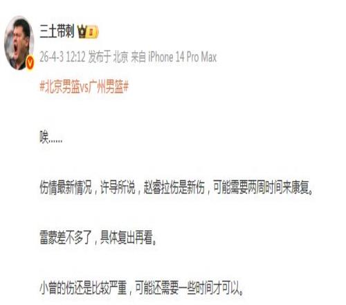 北京時間4月3日,當趙睿在上一輪對陣浙江的賽前因傷臨時退賽,如今根據北京主帥許利民透露,趙睿的拉傷是新傷,可能需要兩周時間來康復,而曾凡博與雷蒙也還在康復過程中。