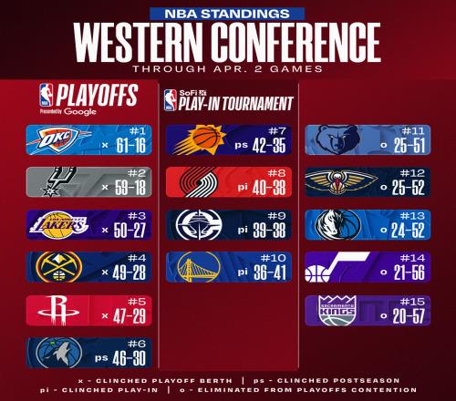 最新排名:火箭&騎士雙雙直通季后賽湖人慘敗與掘金差距縮小 直播吧 2026-04-03 20:46:08 截止今日賽后西部排名籃球免費觀看_NBA免費觀看_湖人免費觀看_籃球高清在線_NBA高清在線_湖人高清在線 籃球 NBA 湖人 勇士 太陽 火箭 快船 開拓者 森林狼 掘金 馬刺 雷霆 76人 凱爾特人 猛龍 黃蜂 騎士 活塞 熱火 老鷹 魔術(shù) 尼克斯 上一篇: 缺了你真不行!本賽季當東契奇缺陣時湖人僅7勝6負 下一篇: 周五競彩籃球強檔:爵士小鬼當家火箭火力全開