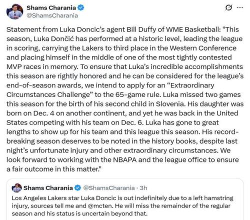 面對(duì)這樣的情況,東契奇經(jīng)紀(jì)人比爾-達(dá)菲火速發(fā)布聲明,將對(duì)65場(chǎng)規(guī)則提出“特殊情況挑戰(zhàn)”,因?yàn)闁|契奇此前曾因?yàn)榕惝a(chǎn)假缺席了2場(chǎng)比賽。