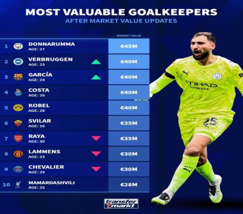 體育播報4月5日宣 轉(zhuǎn)會市場網(wǎng)更新了門將身價排行榜,目前曼城門將多納魯馬身價4500萬歐元最高,在他身后是布萊頓門將維爾布魯根,身價4000萬歐元。