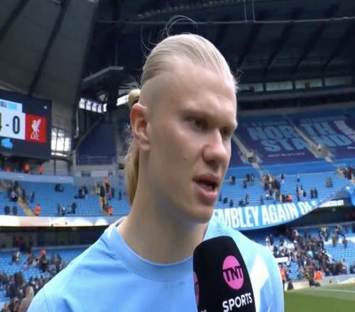 足總杯1/4決賽,曼城主場(chǎng)4-0大勝利物浦,賽后,此役上演帽子戲法的哈蘭德接受了TNT體育的采訪。
