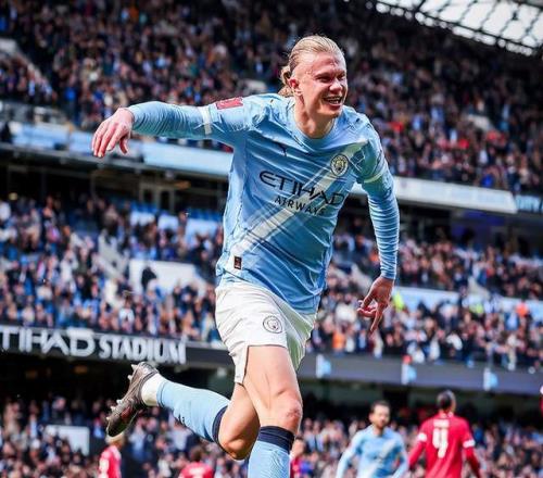 4月4日,足總杯1/4決賽,曼城vs利物浦。利物浦場面占優(yōu),但薩拉赫丟單刀,?;倏私舆B錯失機(jī)會。第37分鐘,范戴克防守過于冒失送上點球,哈蘭德一蹴而就,連續(xù)4個主場攻破利物浦大門,成為近9年來曼城第1人。短短8分鐘,哈蘭德上演梅開二度好戲。