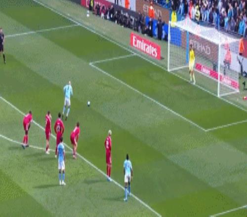 哈蘭德站在12碼處,準(zhǔn)備操刀主罰點球。魔人布?xì)W左腳低射球門右下死角入網(wǎng),曼城1-0領(lǐng)先!