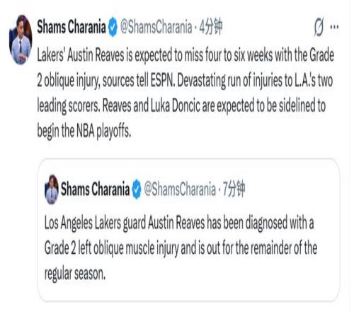 北京時(shí)間4月5日,湖人剛遭遇東契奇左腿筋拉傷、無限期缺陣的打擊,湖人主帥雷迪克又在今日表示,里夫斯對(duì)左側(cè)腹斜肌/肋部區(qū)域進(jìn)行了核磁共振檢查。隨后,壞消息再次傳來,里夫斯被確診為左側(cè)腹斜肌二級(jí)拉傷,將缺席本賽季剩余常規(guī)賽。Shams表示,里夫斯預(yù)計(jì)將缺陣4至6周。湖人兩大核心得分手接連遭遇重傷,形勢(shì)極為嚴(yán)峻。里夫斯與東契奇均大概率將缺席NBA季后賽首輪賽事。