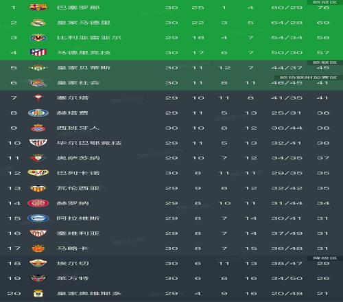 巴薩在第30輪西甲客場2-1戰(zhàn)勝馬競,以25勝1平4負(fù)的戰(zhàn)績積76分高居榜首,領(lǐng)先第二名皇馬7分?;蜀R則在第30輪被馬略卡1-2絕殺,以22勝3平5負(fù)積69分的成績緊隨其后,爭冠主動權(quán)已完全掌握在巴薩手中。比利亞雷亞爾(29輪積58分)與馬德里競技(30輪積57分)分列第三和第四位,占據(jù)著下賽季歐冠聯(lián)賽的入場券。