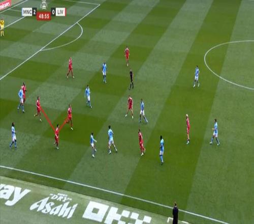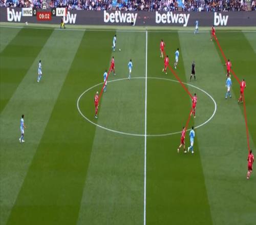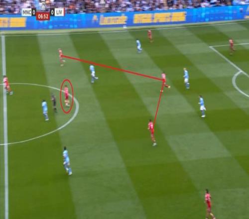 所以在進攻的時候,利物浦的雙前鋒會拉得非常開,幾乎會呈現(xiàn)出各自負責一個半扇的思路,以此來吸引曼城的防守注意力,從而為中路和遠端制造空間。
