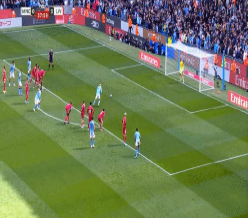 最終在第37分鐘,曼城在定位球二次進攻里,不斷地用帶球和前插來制造利物浦的壓力,一點點打到后衛(wèi)線上,從而制造了范戴克的犯規(guī)和點球機會: