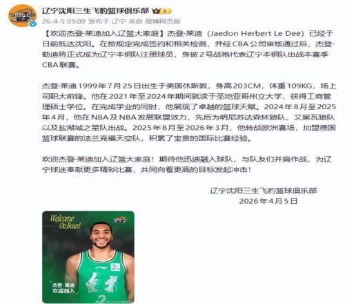 萊迪的加入,意味著遼寧隊本賽季陣容徹底定型:雙外援內(nèi)線+雙外援后衛(wèi)的“2+2”配置成型,兼顧攻防平衡與陣容深度。球隊正全力備戰(zhàn)季后賽,萊迪能否快速融入體系,將成為沖擊總冠軍的重要變量。