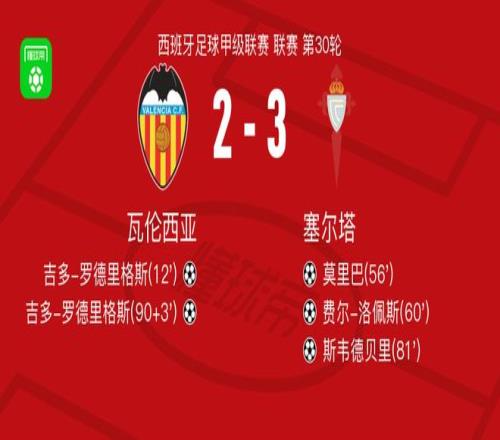 北京時間4月5日西班牙足球甲級聯(lián)賽 聯(lián)賽 第30輪,瓦倫西亞主場對陣塞爾塔。瓦倫西亞吉多-羅德里格斯梅開二度。塞爾塔莫里巴破門,費爾-洛佩斯破門,斯韋德貝里破門。最終比分瓦倫西亞 2-3 塞爾塔。