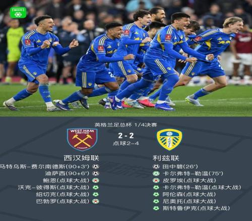 北京時(shí)間4月5日23:30,足總杯1/4決賽,西漢姆聯(lián)對(duì)陣?yán)澛?lián)。上半場(chǎng),奧卡福爾推射被門將撲出,鮑恩小角度打門被門將化解,田中碧折射建功打破僵局。下半場(chǎng),塔蒂頭球攻門擊中立柱,阿倫森禁區(qū)內(nèi)造點(diǎn),勒溫點(diǎn)射破門,費(fèi)爾南德斯、迪薩西三分鐘內(nèi)連入兩球扳平比分,加時(shí)賽雙方均無建樹。點(diǎn)球大戰(zhàn),西漢姆聯(lián)球員鮑恩和巴勃羅丟點(diǎn),斯特魯伊克罰進(jìn)制勝點(diǎn)球,最終,利茲聯(lián)4-2點(diǎn)殺西漢姆聯(lián),總分6-4晉級(jí),利茲聯(lián)時(shí)隔39年再次打進(jìn)英格蘭足總杯四強(qiáng),半決賽將對(duì)陣切爾西。