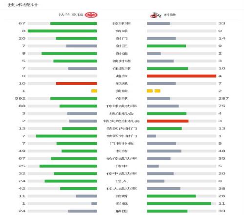 北京時間4月5日德國足球頂級聯(lián)賽 聯(lián)賽 第28輪,法蘭克福主場對陣科隆。法蘭克福伯卡特破門,卡利穆恩多破門??坡】魉够崎T,卡斯特羅-蒙泰斯破門。最終比分法蘭克福 2-2 科隆。