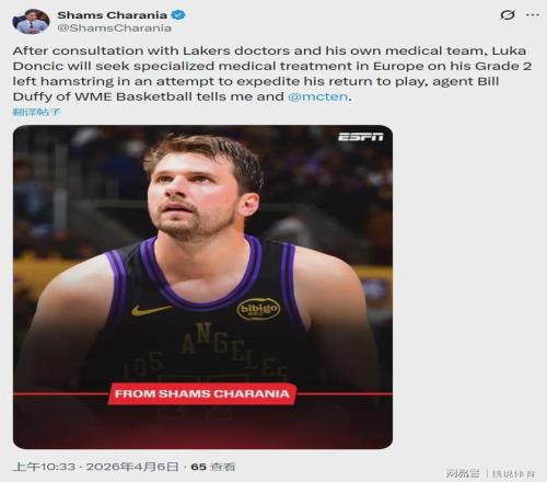 北京時間4月6日,NBA常規(guī)賽激戰(zhàn)正酣,湖人球星東契奇的傷病進展牽動聯(lián)盟目光。據(jù)NBA名記Shams最新報道,東契奇將啟程前往歐洲,接受左腿筋二級拉傷的專項醫(yī)療治療,全力加速康復進程,爭取早日重返賽場。