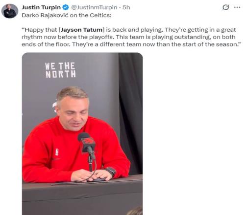 就連猛龍主帥拉賈科維奇談到這支綠凱時(shí)都贊不絕口:很高興塔圖姆回歸了。在季后賽來臨前他們已經(jīng)進(jìn)入一個(gè)很好的狀態(tài),這支球隊(duì)非常出色,無論是進(jìn)攻還是防守都做得很好,與賽季初相比,這支球隊(duì)因?yàn)樗D姆的加入截然不同了。