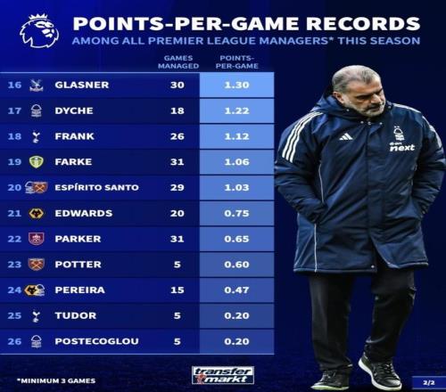 到了榜單末尾,帕克(0.65分)、波特(0.60分)、佩雷拉(0.47分)、圖多爾和波斯特科格魯(0.20分),這些數(shù)據(jù)已經(jīng)不是“狀態(tài)不好”能解釋的了,而是球隊(duì)已經(jīng)徹底崩盤(pán)。尤其是狼隊(duì),進(jìn)攻全聯(lián)賽最差,主帥場(chǎng)均分不到0.5,這種數(shù)據(jù)組合在英超保級(jí)史上,基本就是“死刑宣告”。