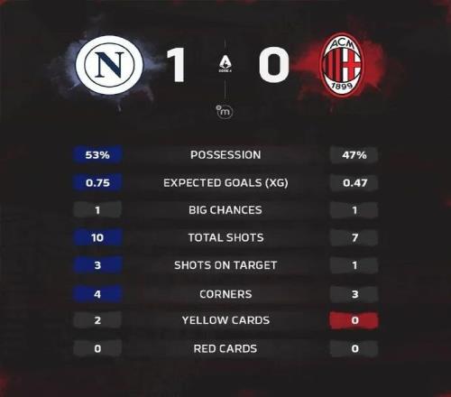 下半場(chǎng)補(bǔ)時(shí)5分鐘。最終全場(chǎng)比賽結(jié)束,那不勒斯1-0米蘭。