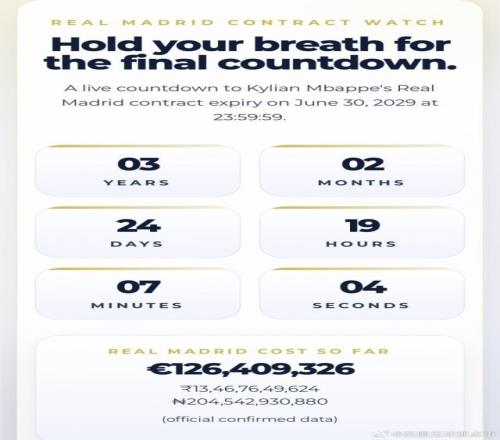 皇馬球迷專門做了一個網(wǎng)站,實時倒計時姆巴佩與皇馬的合同到期時間(2029年6月30日23:59:59)以及花費成本