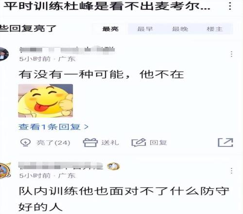 有球迷賽后發(fā)帖提問:平時訓練杜峰是看不出麥考爾菜嗎?評論區(qū)廣東球迷給出了2條腦回路奇特但邏輯上完全說得過去的回答:1、有沒有一種可能,他不在;2、隊內(nèi)訓練他(麥考爾)也面對不了什么防守好的人。
