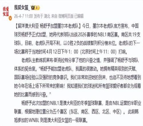 北京時間4月7日消息,中國女籃新任隊長楊舒予,正式加盟澳大利亞NBL1南區(qū)聯(lián)賽墨爾本老虎隊,開啟個人職業(yè)生涯的首次留洋之旅。這一舉動,不僅標志著她從WCBA冠軍核心邁向國際舞臺的跨越,更向世界宣告:中國女籃的未來,正由一位兼具天賦、智慧與領袖氣質(zhì)的年輕隊長所定義。