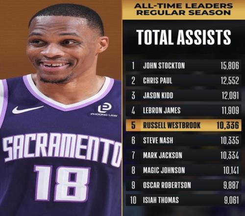 3月18日,聯(lián)盟官宣了一個硬核消息:威斯布魯克的生涯總助攻正式?jīng)_到了歷史第5。他在對陣馬刺的那場比賽里,一口氣超了馬克·杰克遜和納什,排名連跳兩級。