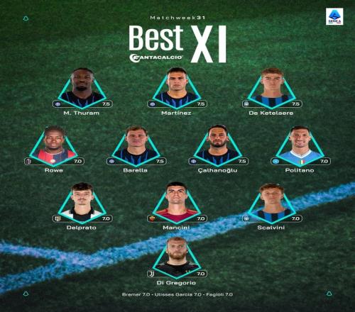 意甲官方本輪最佳陣:國米4人入選,迪格雷戈里奧、曼奇尼在列 直播吧 2026-04-08 07:53:48 體育播報4月7日宣 意甲官方公布第31輪最佳11人陣容,國米4人入選。門將:迪格雷戈里奧(尤文圖斯)后衛(wèi):德爾·普拉托(帕爾馬)、詹盧卡·曼奇尼(羅馬)、斯卡爾維尼(亞特蘭大)中場:喬納森·羅(博洛尼亞)、巴雷拉(國米)、恰爾汗奧盧(國米)、波利塔諾(那不勒斯)前鋒:圖拉姆(國米)、勞塔羅(國米)、德凱特拉雷(亞特蘭大)足球免費觀看_意甲免費觀看_國際米蘭免費觀看_足球高清在線_意甲高清在線_國際米蘭高清在線 足球 意甲 國際米蘭 尤文圖斯 那不勒斯 亞特蘭大 帕爾馬 羅馬 博洛尼亞 上一篇: 塔奇納迪:感覺阿萊格里只想平局,如果莫德里奇不靈米蘭就癱瘓了 下一篇: 米蘭官方曬照,自2月底以來一直因傷缺陣的加比亞回歸合練