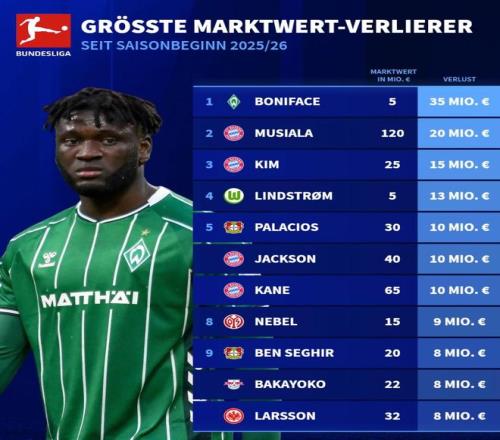北京時(shí)間4月7日,德轉(zhuǎn)列出了2025-26賽季德甲球員的身價(jià)降幅榜,去年夏天從勒沃庫(kù)森租借加盟云達(dá)不萊梅的博尼費(fèi)斯因飽受傷病困擾身價(jià)暴跌3500萬(wàn)歐元排名第一,穆西亞拉下跌2000萬(wàn)歐元第二,金玟哉下跌1500萬(wàn)歐元第三。
