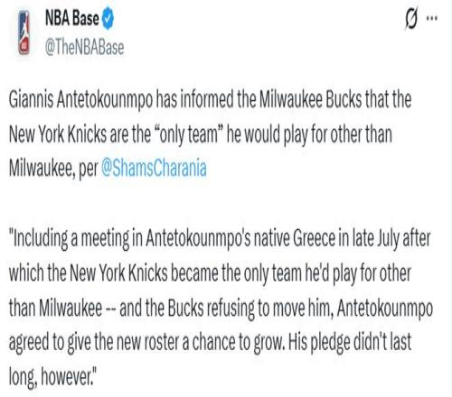 Shams還報道稱,字母哥已告知雄鹿:除雄鹿外,他只為紐約尼克斯效力。“去年7月底,雙方在字母哥的家鄉(xiāng)希臘會面后,字母哥就明確——除雄鹿外,尼克斯是他唯一愿意效力的球隊。盡管如此,雄鹿仍拒絕交易他,字母哥才同意給新陣容一次磨合機(jī)會。然而,這份承諾并沒有維持多久。”