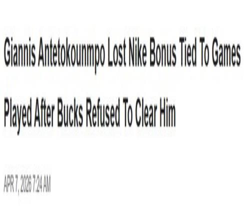北京時間4月8日,名記Shams報道稱,據(jù)多位消息人士透露,密爾沃基雄鹿在賽季末決定不讓字母哥出場,讓他在場外也遭受了重大經(jīng)濟(jì)損失。雄鹿讓這位招牌球星休戰(zhàn)的決定,直接導(dǎo)致他沒能拿到耐克代言合同里一筆大額獎金——該條款要求他本賽季至少出戰(zhàn)41場。