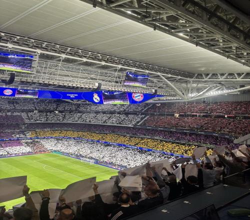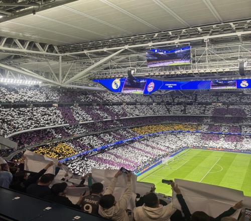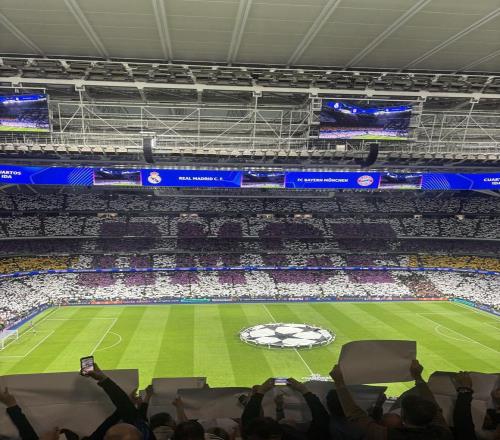 本場比賽伯納烏球場人聲鼎沸,賽前歐冠主題曲響起時,全場球迷聯(lián)合展示了一幅360度拼接式Tifo。這幅Tifo幾乎覆蓋看臺全景,將皇馬俱樂部的隊徽核心圖案以及皇馬隊名(RMCF)融入進(jìn)去,呈現(xiàn)出強(qiáng)烈的立體感視覺效果。