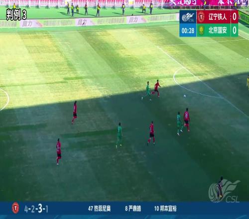 中超聯(lián)賽第4輪,遼寧鐵人楠波灣VS北京國安。比賽第1分鐘,遼寧鐵人21號(hào)守門員在本方罰球區(qū)外手觸球。裁判員判遼寧鐵人21號(hào)守門員手球犯規(guī),由北京國安隊(duì)踢直接任意球恢復(fù)比賽,并向遼寧鐵人21號(hào)守門員出示黃牌警告。VAR未介入。